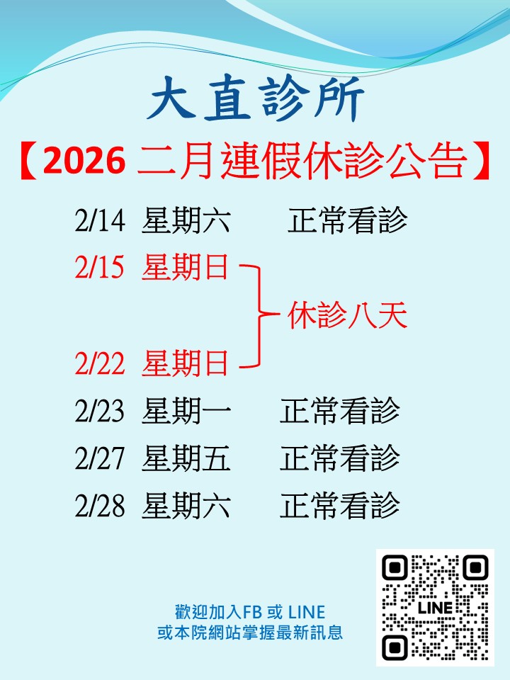 【2026 二月連假休診公告】 2/14(星期六) 正常看診