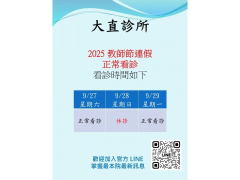 2025 9/27, 9/29 教師節連假 正常看診